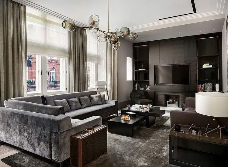 A masculine interior often starts with the right color palette. Traditional masculine tones—greys, blacks, browns, navy—still work beautifully, but the key is combining them with warmer accents to avoid a cold or impersonal feel.