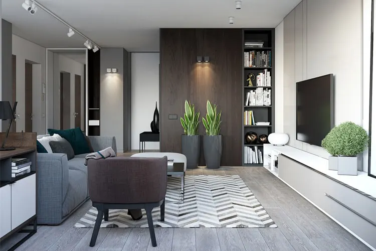 The golden rule is to keep a neutral base and play with contrasts. A light grey living room with a deep blue accent wall and walnut furniture creates a masculine atmosphere without feeling heavy.