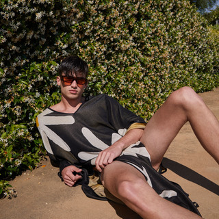 Con motivos florales en blanco y negro y tonos claros, azules y rosados, Summer of Love nace como una completa línea de piezas confeccionadas con técnica de Jacquard en punto de seda que incluye un vestido, una chilaba, twin sets de chaquetas, camisas y pantalones, un top, shorts y pareos.