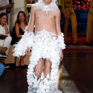 Debut of this young Andalusian designer, he is only 19 years old, at Madrid Fashion Week ... and he passed the test. Palomo chose for his show a well-known hotel of the capital and turned it into Hotel Palomo Spain to show us that for him too much is not enough; giant bags, dresses of feathers and rich brocades, cascades of white sequins, tulle that twist like multicolored corollas, bathrobes turned into suits of jacket, doormen with booties. In his universe men and women look indistinctly all the pieces which is seem to be a celebration of hedonism without remorse.
