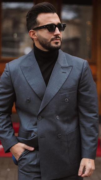 A dark suit (navy, charcoal, or black) is always a safe bet, but for Christmas you can soften it with a fine merino knit or turtleneck.