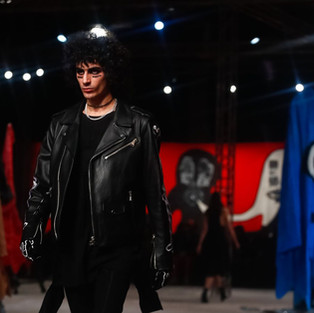 Guzman’s drawings and graffiti, easily recognisable for their bold colours and surrealist touch, were scattered throughout the collection as a kind of retrospective of 20 years of the artist’s work in New York’s Downtown district, south of Manhattan. Guzman’s art was displayed on rather simple casual wear such as sweaters, denim, check-shirts, jackets, and parkas, among other garments. Appliqués, embroidery, and prints were joyful and extravagant but had a dark side too, seen through images of skeletons, knives, and dripping eyes among others.